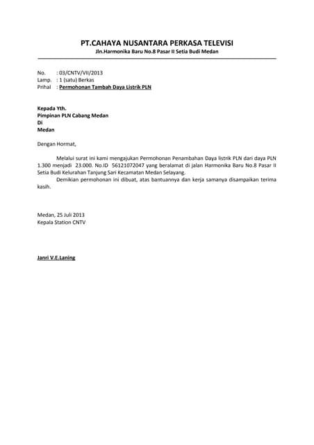 Contoh surat permohonan tambah daya ke pln kumpulan persero cabang .